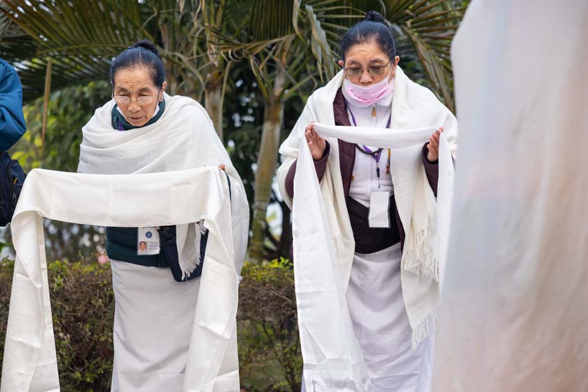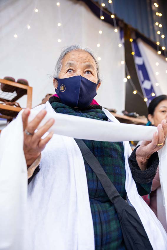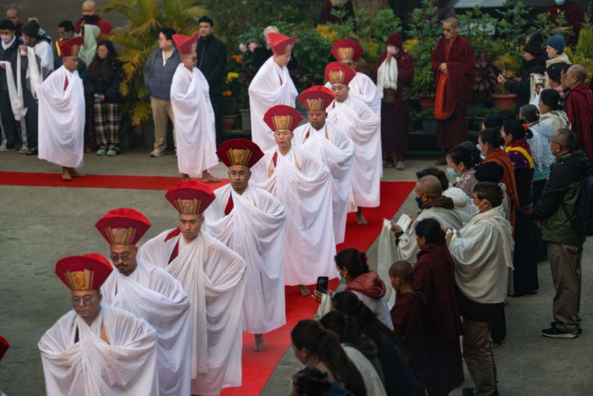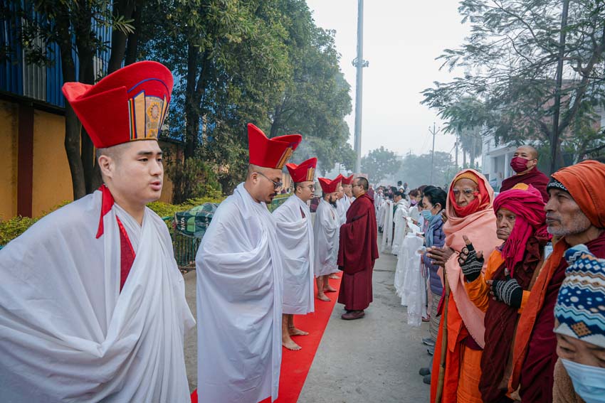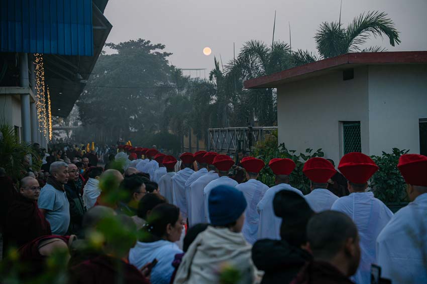 At 6.30am the retreat monks emerged from Tergar shrine hall and wrapped wet sheets around their bodies—the traditional way of proving achievement in tummo is to dry a wet sheet with the body heat generated by the practice. Wearing lower garments, meditation belts, meditation hats and the wet white robes, they proceeded clockwise along a carpeted route from Tergar monastery to the Kagyu Monlam Pavillion, greeted by crowds of devotees who lined the path.