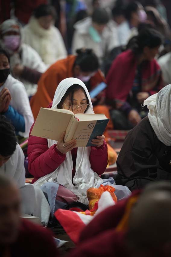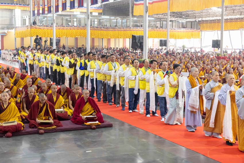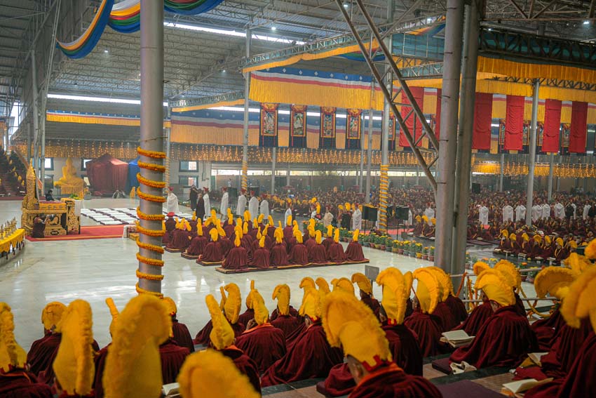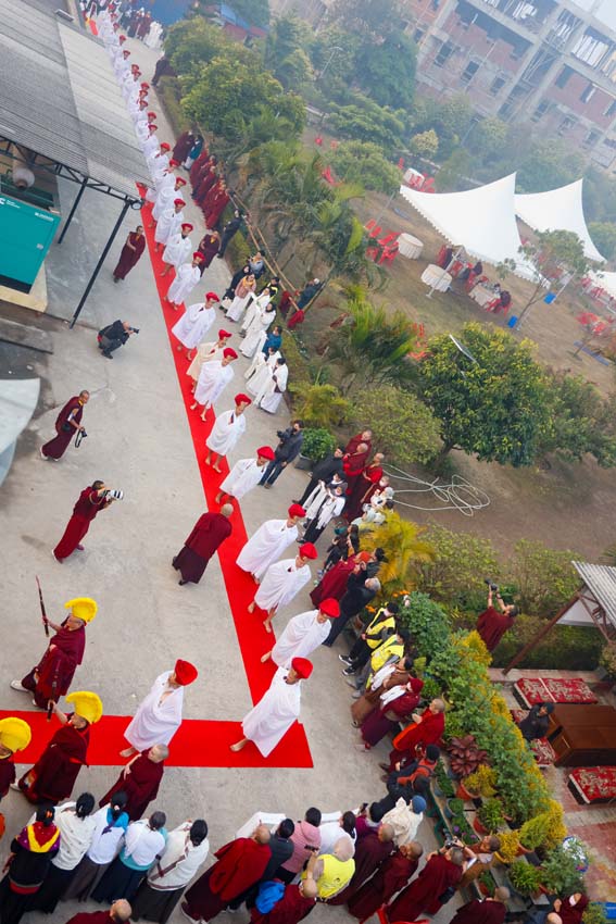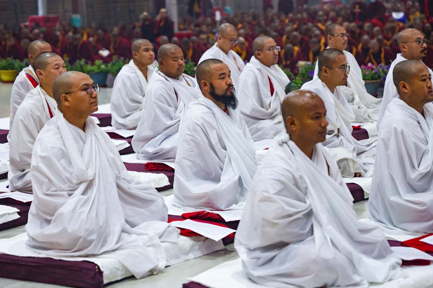 In the Monlam Pavillion monks. Nuns and lay practitioners gathered to receive the Mahayana sojong vows from Kyabgon Zurmang Gharwang Rinpoche and then recited the opening prayers of the first session.