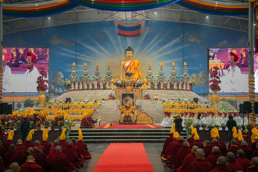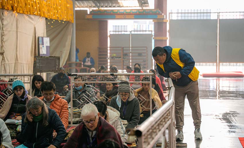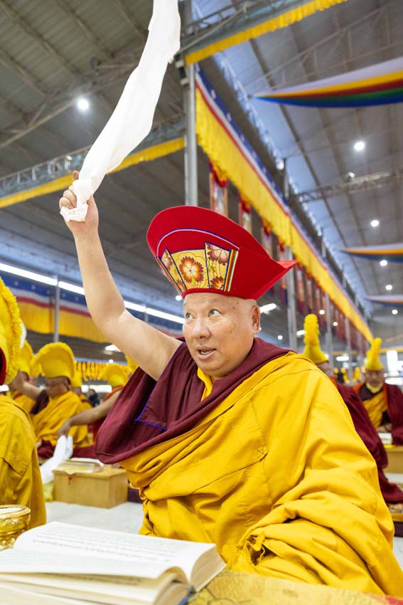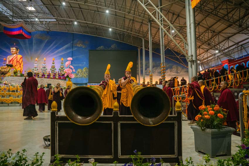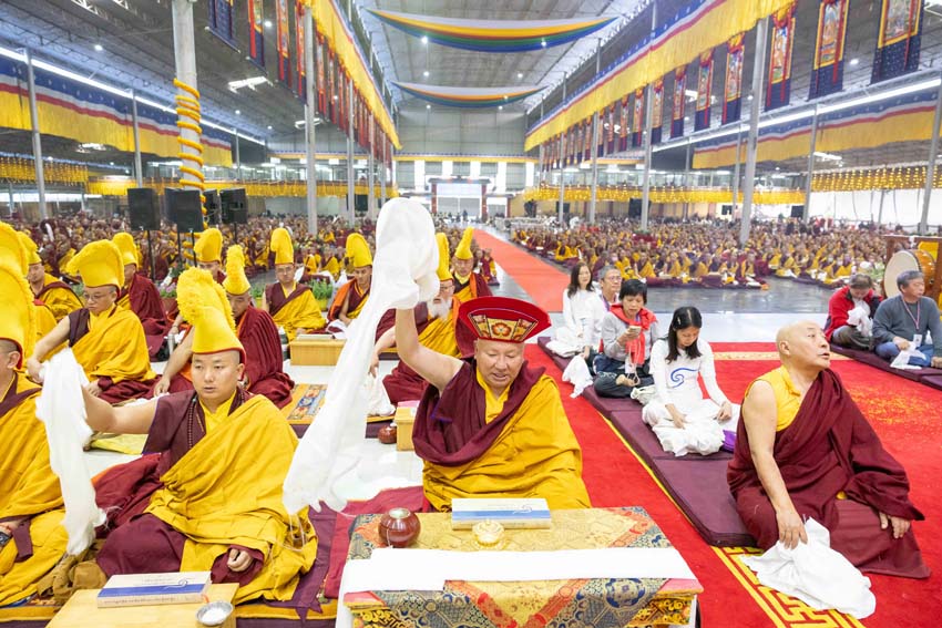 During the fourth branch of inviting, the retreat practitioners entered the pavillion through the main gate and took their seats on the right side of the stage. During the eleventh branch, the offering section, when making the offering of practice, monastics from the Kamtsang shedras engaged in a demonstration philosophical debate. After the debate concluded, a monk from Tergar shedra summarised what had been said to complete the offering of practice.