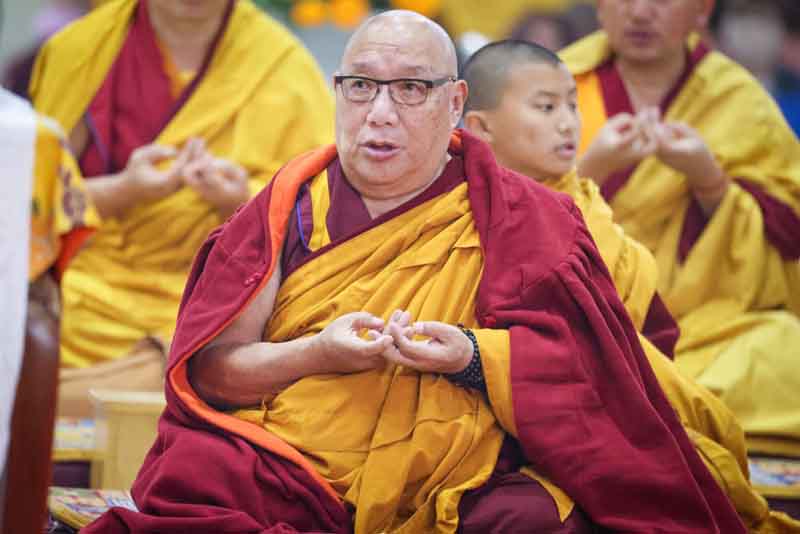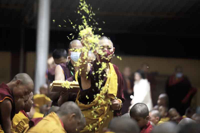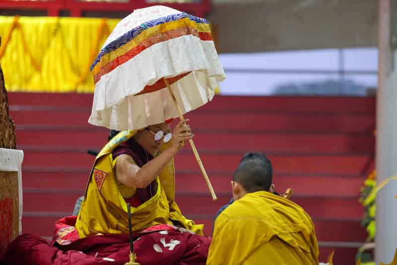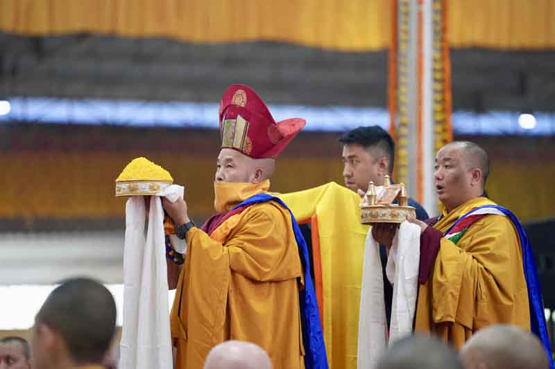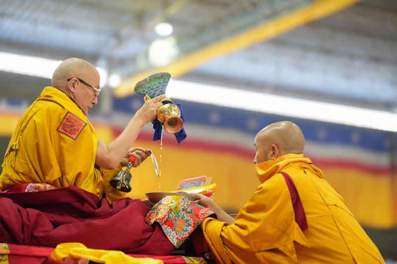 In the morning, His Eminence Goshir Gyaltsab Rinpoche performed the main empowerment ritual. In the afternoon, beginning at 2 o'clock, he started bestowing the actual empowerment. First, His Eminence Gyaltsab Rinpoche, dressed in elaborate silk brocade robes, was escorted into the pavillion and took his seat on the great dharma throne. Kyabje Bokar Choktrul Rinpoche and Bokar Khenpo Rinpoche Lodro Dönyo offered prostrations on behalf of the entire assembly. The chant master led the recitation of the short supplication to Dorje Chang and the Thirty-Seven Mandala Offering. The head lamas and sponsors from Gyaltsab Rinpoche’s Ralang Monastery in Sikkim offered a threefold body-speech-mind mandala.
