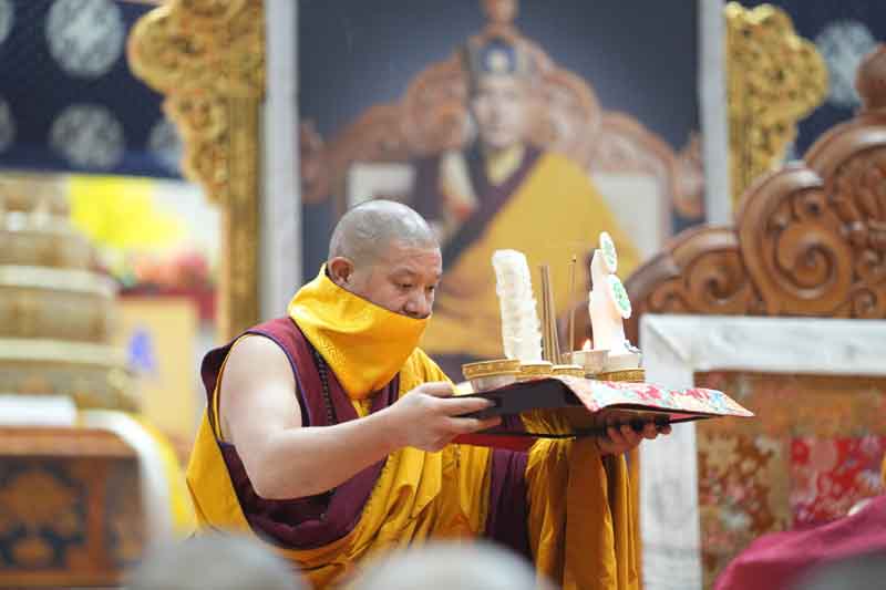 Then His Eminence Gyaltsab Rinpoche gave extensive and profound explanations of the stages of the empowerment. Finally, he completed the bestowing of the full main empowerment of Vairocana Abhisaṃbodhi to the entire assembly. During the empowerment transmission, Kyabje Bokar Choktrul Rinpoche and other high lamas received the empowerment blessings directly, on behalf of everyone. At the conclusion of the empowerment there was a thanksgiving ceremony, during which Lama Karma Chodrak, the director of the Monlam Chenmo, along with key staff members, offered an elaborate three-fold mandala with representations.