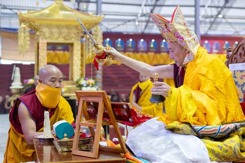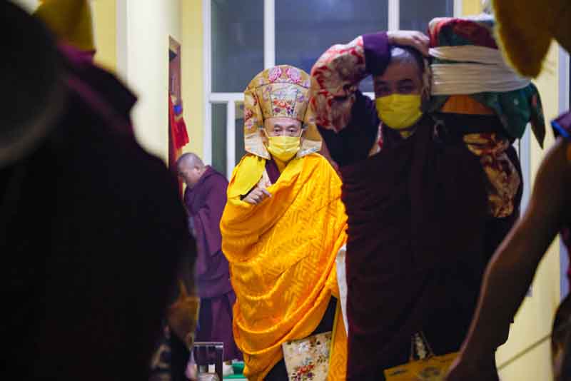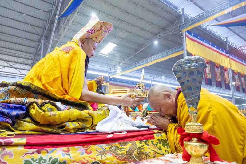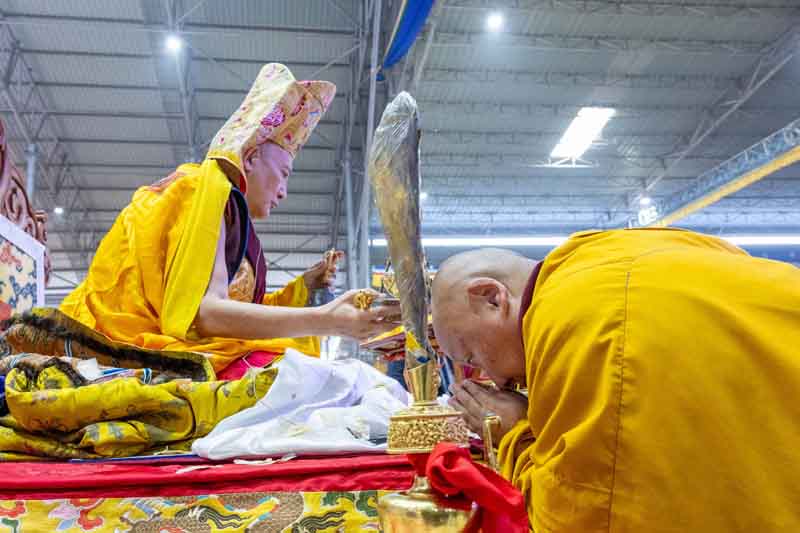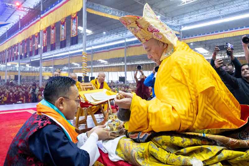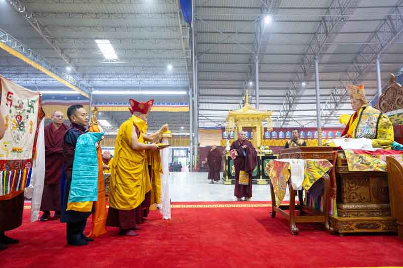 At 9:30 am, Kyabgon Drung Goshir Gyaltsab Rinpoche and the Red Crown in its brocade covered box, were escorted into the Monlam pavillion in an elaborate procession. Chief Minister Prem Singh Tamang left his seat and prostrated to Rinpoche with great devotion. Following a mandala offering from the Sikkimese, led by the Chief Minister and the Minister for Ecclesiastical Affairs, the ritual began. At the conclusion of the ceremony, Rinpoche spoke briefly.